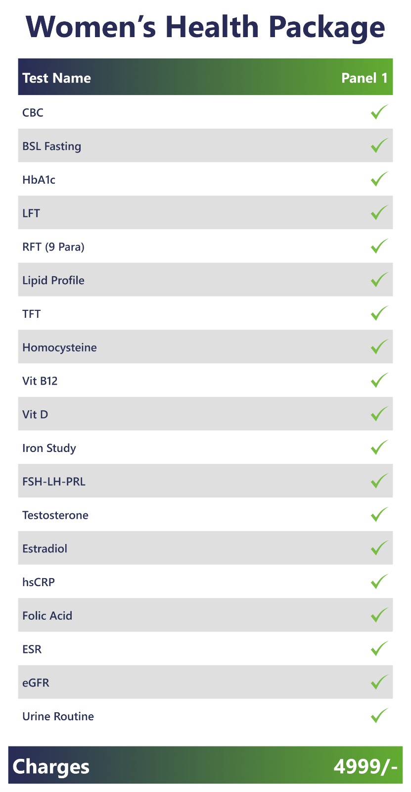 This full body checkup is specifically curated for people who have no prior illness/disease and are at high risk of contracting disease due to poor lifestyle choices. This package includes screening tests & panels that can help identify underlying ailments/ diseases giving essential insights into heart, liver, kidney, bones, diabetes, anaemia & thyroid health.